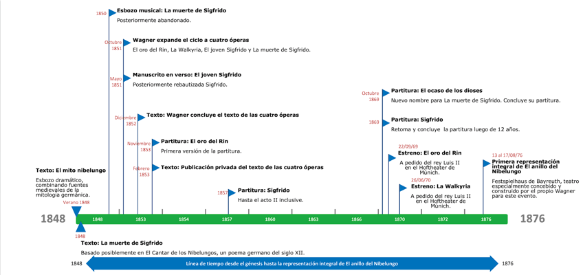 Línea de tiempo desde el génesis hasta la representación integral de "El anillo del Nibelungo".