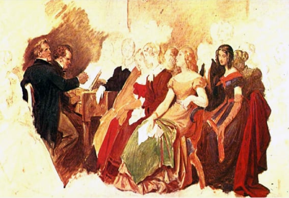 Schubert, al piano, acompaña al cantante Michael Vogl en una velada en casa de amigos —Oleo inacabado de Moritz von Schwind, 1868—.