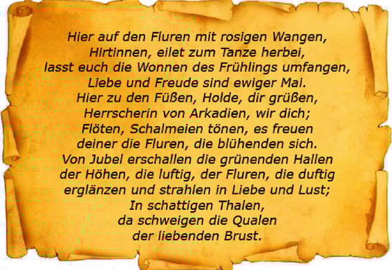 Arrebatados sonidos golpean sus ecos en las verdes laderas, las frescas y fragantes colinas destellan y relucen en amor y deleite; en el sombrío valle se aquietan los tormentos del amante corazón!
