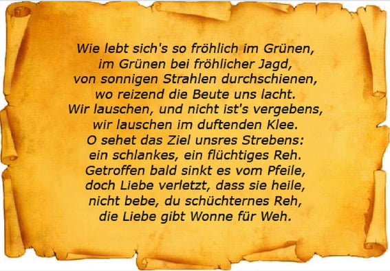 Qué alegre es la vida entre el verdor, entre la hierba, detrás de una cacería traviesa, entre los rayos del sol, que reverberan, donde el juego de la persecución nos mantiene alegres. Ah, la caza traviesa, donde el juego nos mantiene alegres!