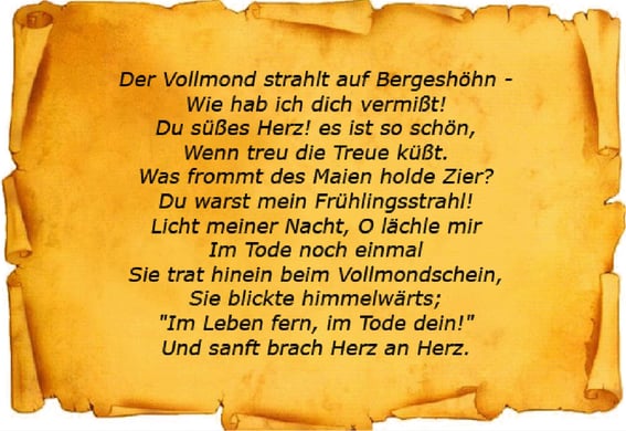 La luna llena brilla en la cumbre de las montañas. Te he extrañado tanto, dulce corazón mío. Qué hermoso es cuando los que se guardan fidelidad se dan verdaderos besos. Brillante adorno que santificas a Mayo, eres para mí el resplandor de la primavera. Ilumina mi noche, oh sonríeme una vez más en la muerte.