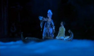 Aproximándose al lugar donde reposa el cuerpo de la Princesa, besa sus labios con ternura, Aurora abre los ojos y se levanta lentamente siendo abrazada por el Príncipe que la libra de la maldición de la bruja Carabosse.